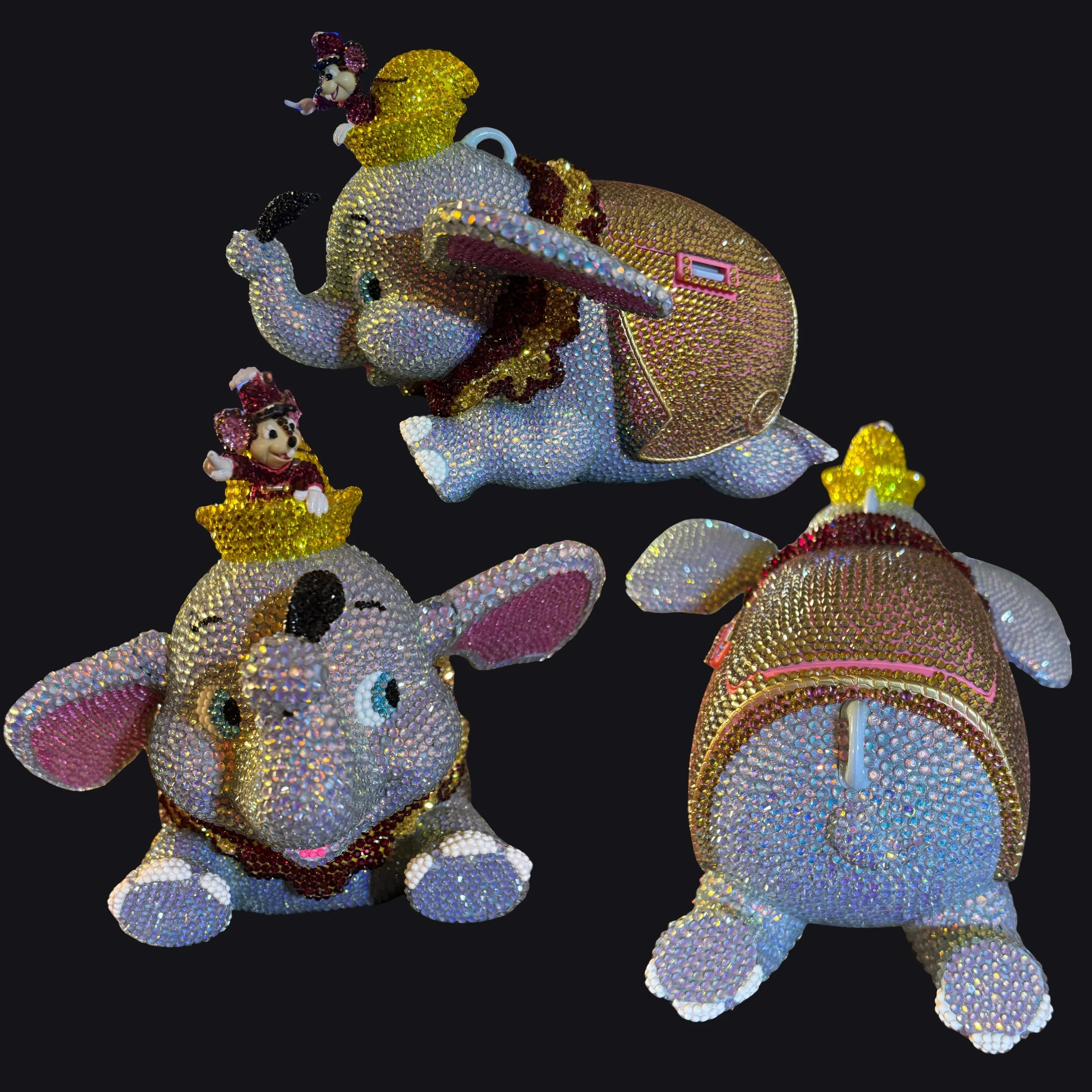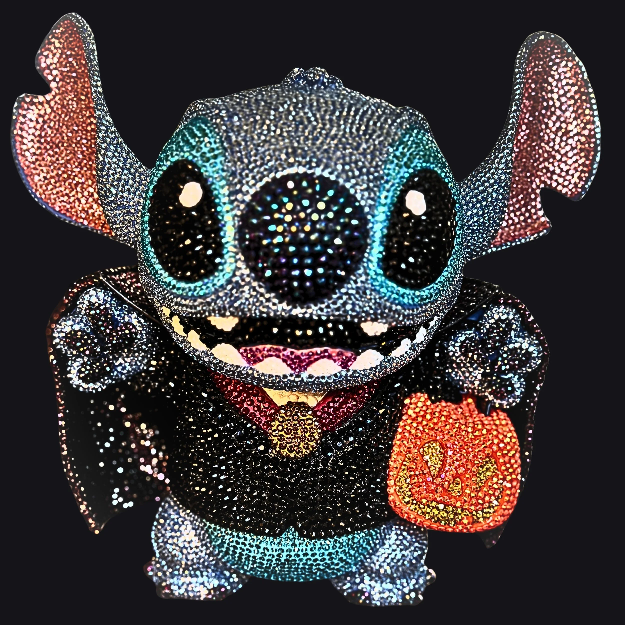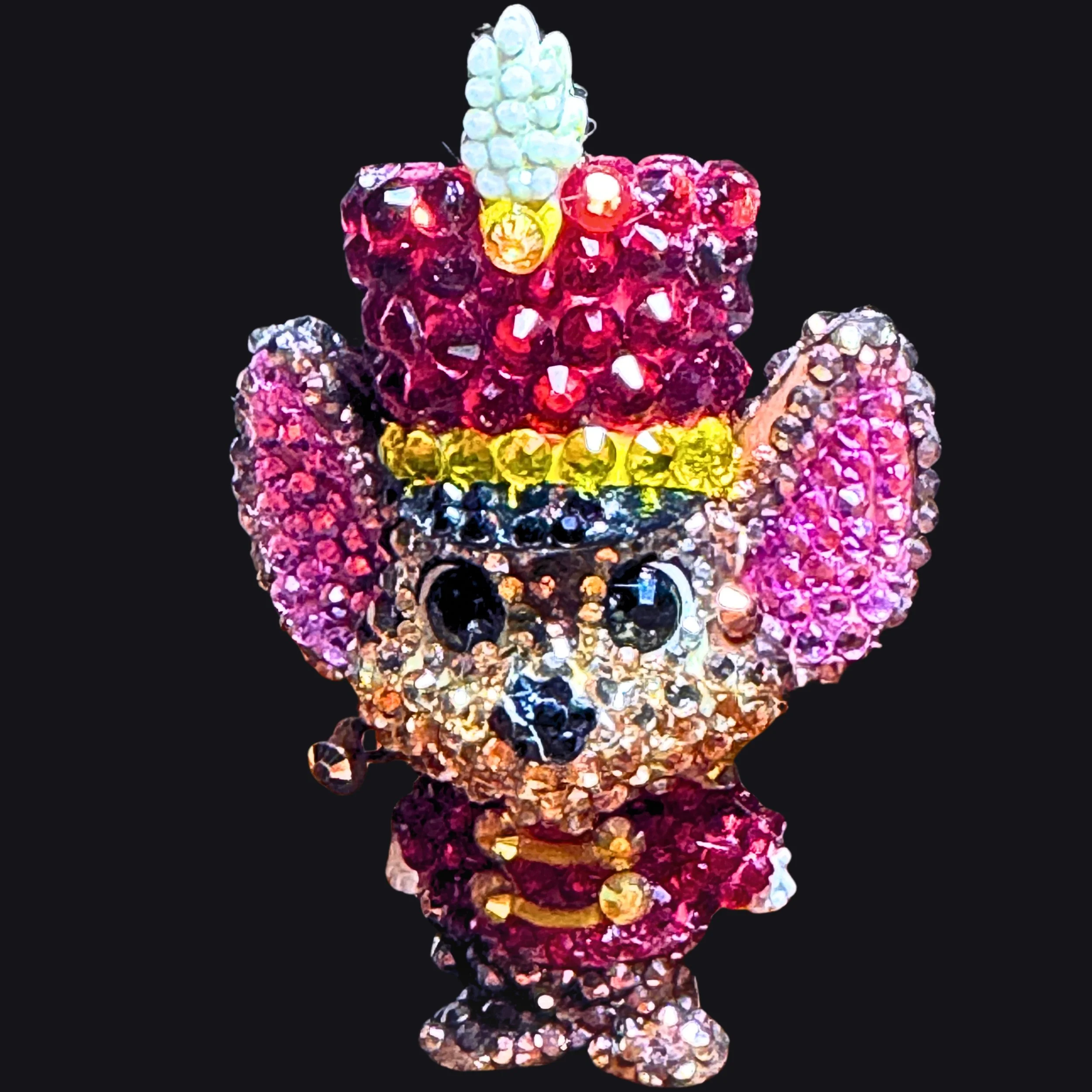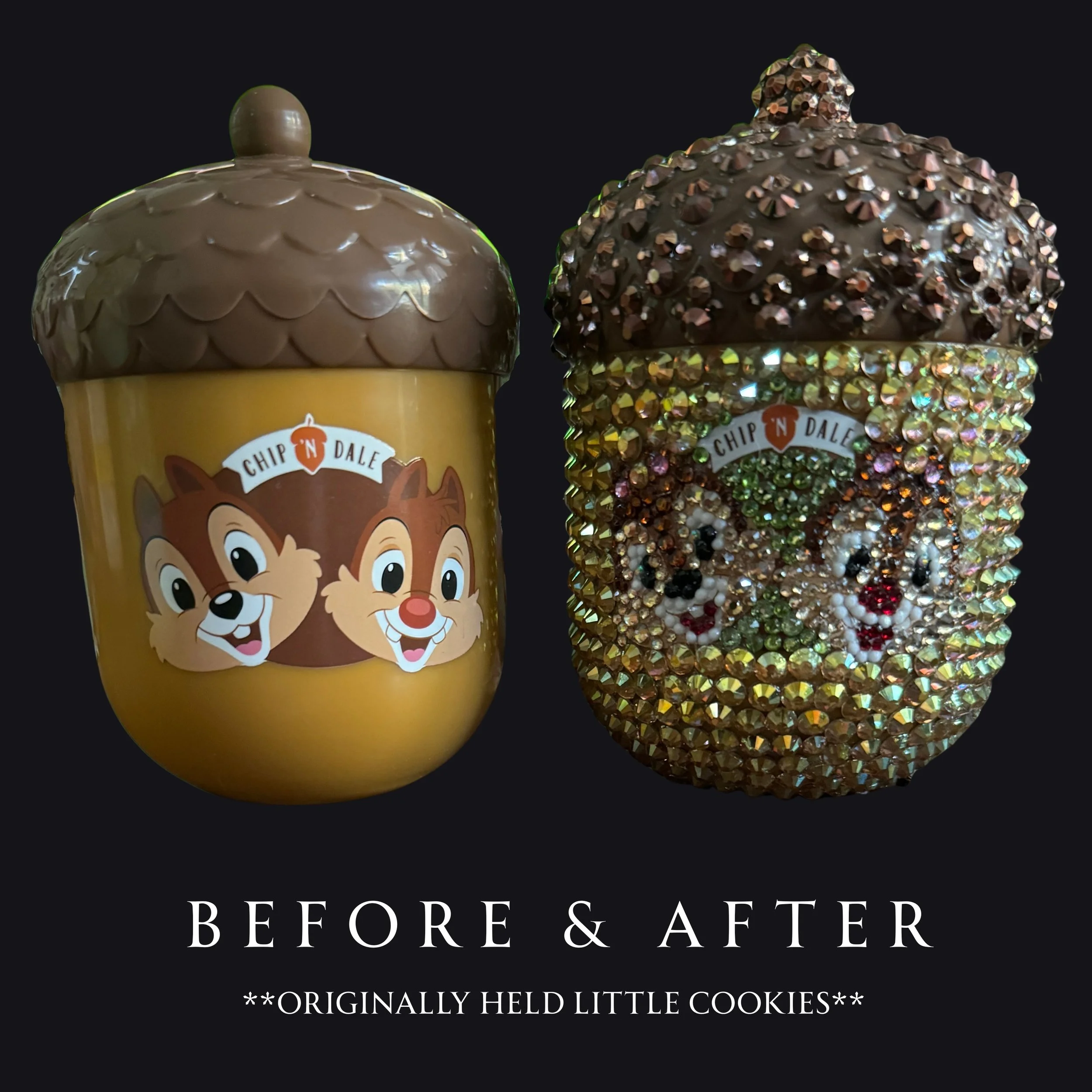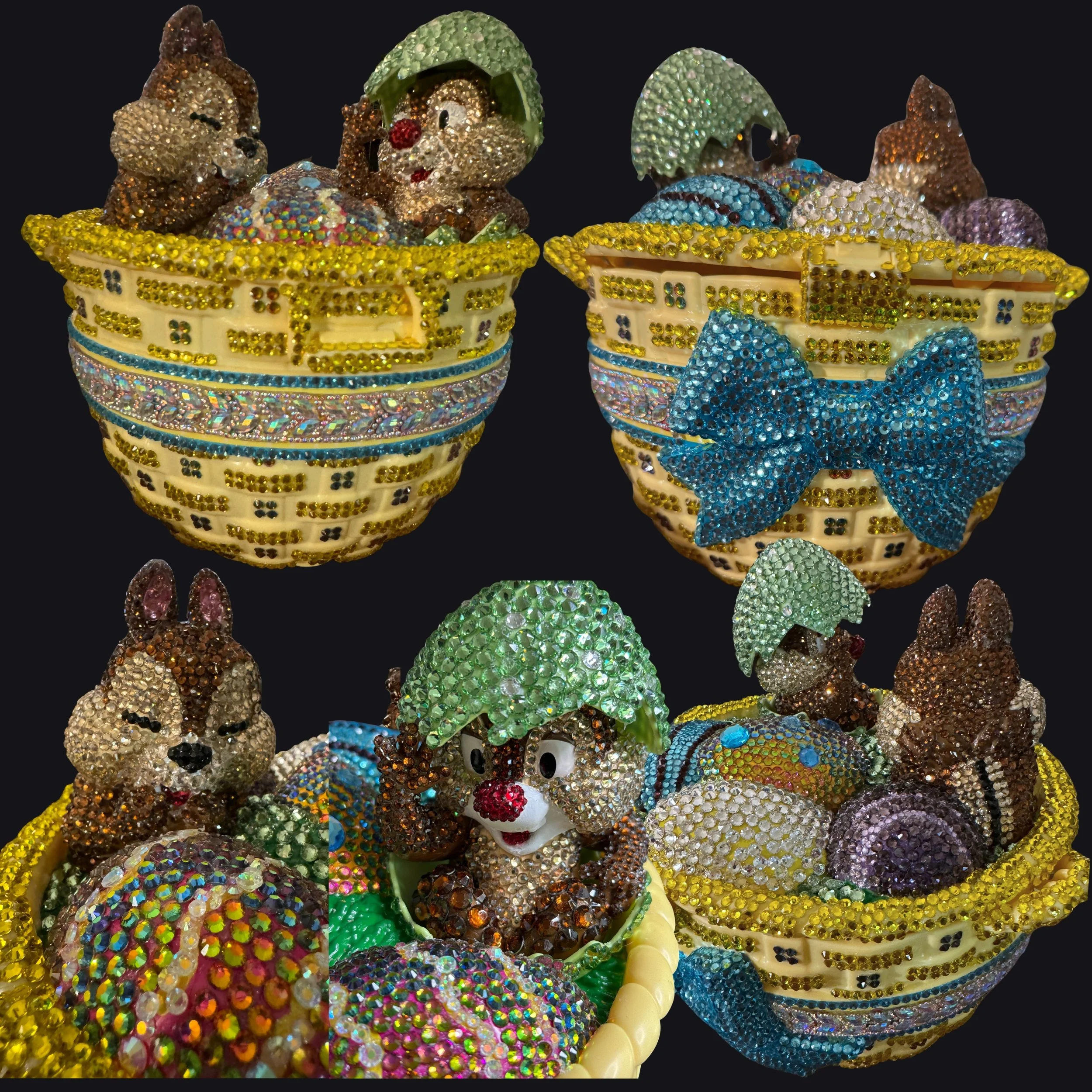This bucket took forever and has so much detail and color…He’s hard to part with! With over 2000 rhinestones, this Popcorn Bucket will become an amazing conversation piece any time of the year. He was never used as a popcorn bucket. His mouth was sealed closed to help with balance once all the rhinestones were applied. He is sturdy!